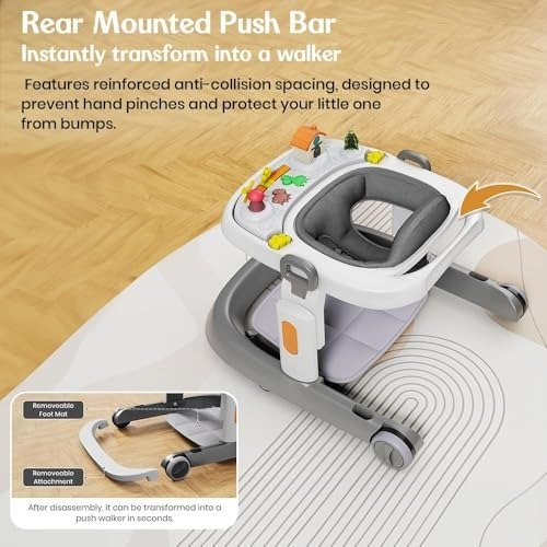 - VERSATILE 3-IN-1 BABY WALKER: This stylish activity walker offers three distinct functions to nurture your little one?s growth. In Bounce Mode, it softly bounces in sync with your baby?s motions, helping to build balance and strengthen core muscles. As your child develops, transition effortlessly to Walking Mode, delivering reliable support for adventurous first steps.