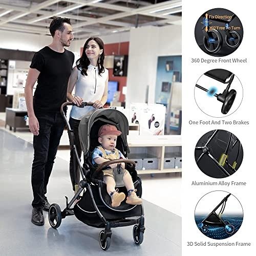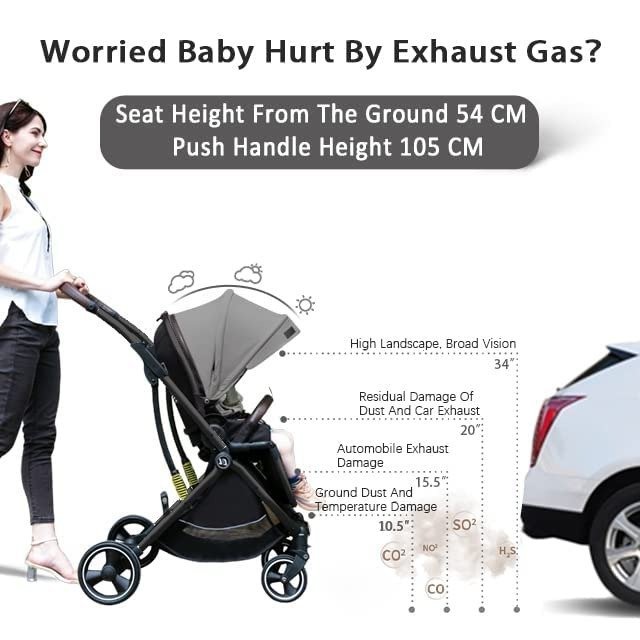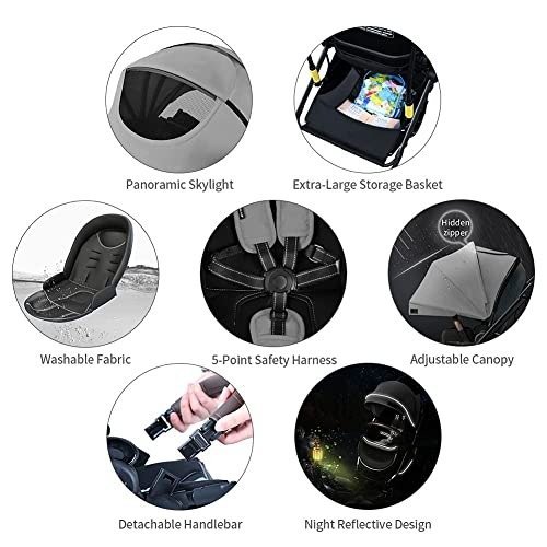 - Shock-Absorbing Rubber Wheels: Featuring large 12-inch rear rubber tires with multiple braking systems and front swivel wheels equipped with brakes, this stroller guarantees both safety and comfort for your child. It complies with both European and American safety standards, and comes fully equipped with essential safety elements such as four-wheel brakes, a five-point safety harness, an anti-UV canopy, and more.