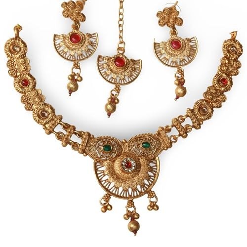 - Elegant Craftsmanship: This classic gold-plated jewelry ensemble boasts elaborate designs and motifs, highlighting the skill of Indian artisans.