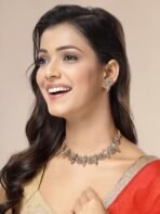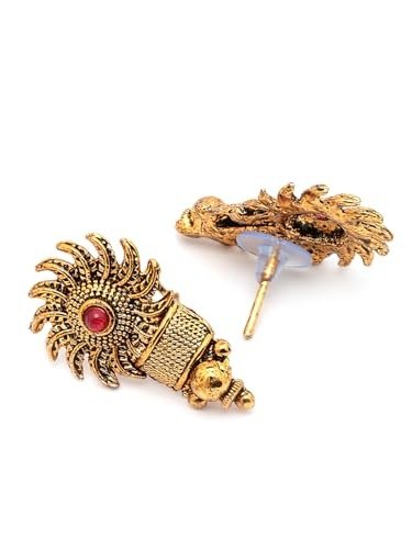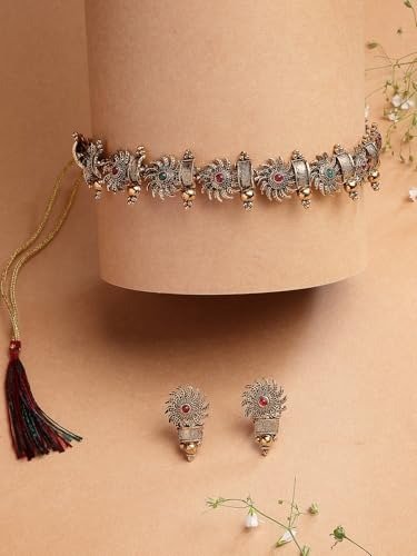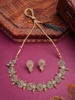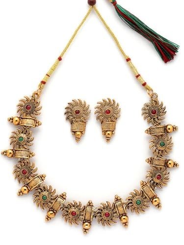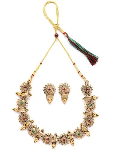 Sukkhi Indian Traditional 18k Gold Plated Choker Necklace Set with Stud Earrings for Women & Girls | NS107349 Embrace your cultural roots with the Sukkhi Indian Traditional 18k Gold Plated Choker Necklace set, adorned with striking red and green details. This exquisitely crafted ensemble includes a pair of matching stud earrings, thoughtfully designed to enhance the ornate choker. The gold plating accentuates the vivid colors, making it perfect for festivals, weddings, and other special events. Ideal for women and girls who appreciate classic ethnic jewellery, this set infuses a bold and festive flair into traditional outfits. Its intricate design and lively shades make it a remarkable accessory, adding a touch of timeless elegance and cultural allure to your jewellery collection.