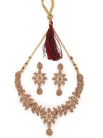 Radiate sophistication with the Sukkhi Stunning Gold Plated AD Stone Collar Bone Necklace and Earring Jewelry Set, a remarkable collection designed specifically for women who appreciate refinement. This set features brilliant AD stones artfully embedded in lustrous gold plating, producing an enchanting shimmer that captivates all who behold it. The collar bone necklace elegantly accentuates your neckline, leaving a striking impression, while the coordinating earrings infuse your ensemble with an air of elegance. Expertly crafted with attention to detail, this set guarantees both longevity and a hint of opulence. Embrace the charm of this exquisite Sukkhi jewelry set, a genuine emblem of magnificence and style.