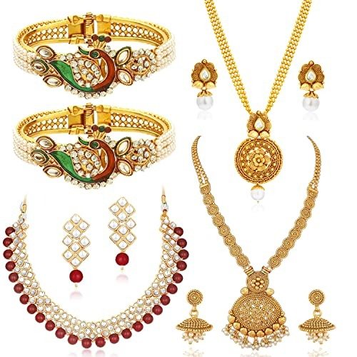 Introducing the Sukkhi Exclusive Gold Plated Jewellery Combo Set for Women, crafted from high-quality alloy. Women have a deep appreciation for jewellery, particularly traditional pieces that hold a special place in their hearts. This exquisite set is perfect for various occasions, including ring ceremonies, weddings, and festive celebrations. Additionally, it can be worn on a daily basis to add a touch of elegance to any outfit. Create unforgettable moments with this stunning collection, which showcases a distinctive traditional design with an antique finish.
