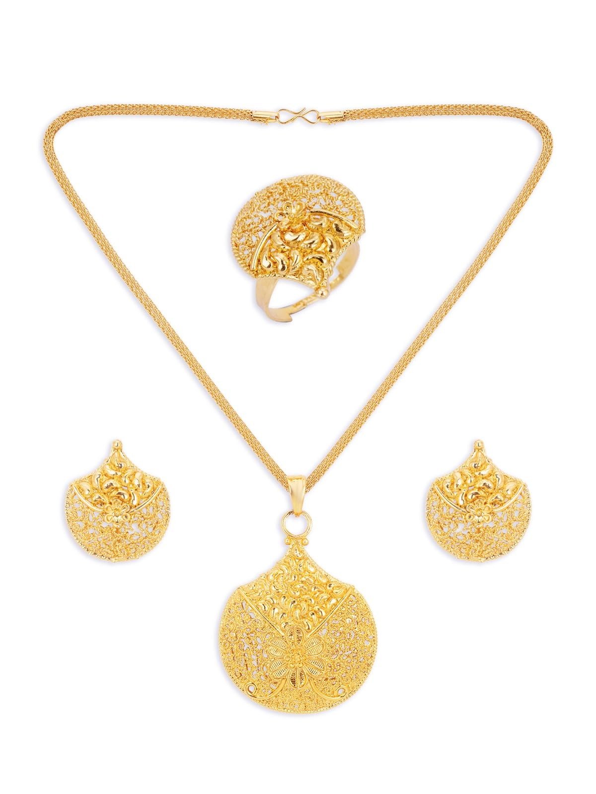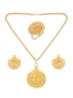 This Sukkhi Indian Wedding Gold Plated Combo Pendant Set for Women is crafted from brass casting. Women have a deep appreciation for jewelry, as it holds a special significance in their lives. They adorn themselves with it for various occasions, particularly during ring ceremonies, weddings, and festive celebrations. Additionally, it can be worn on a daily basis. Create unforgettable moments with this exquisite collection. This jewelry showcases a distinctive, traditional design enhanced by a glossy finish.