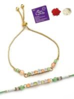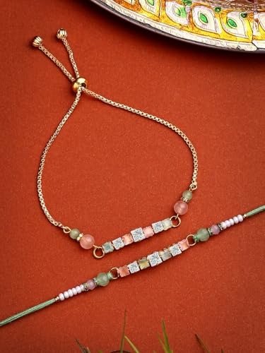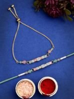 Sukkhi Rakhi Elegant Gold-Plated Kundan with Beadable Rakshabandhan Combo Lumba Rakhi for Brother and Sister-in-Law, Complete with Roli, Chawal, and Greeting Card | Set of 2 | CBRAKL107462 | Celebrate the cherished connection of love and unity with Sukkhi?s exquisite Bhaiya Bhabhi rakhi set, featuring gold plating, shimmering AD stones, and intricate beads. This beautifully designed combo includes a rakhi for Bhaiya and a complementary Lumba rakhi for Bhabhi, representing love and reverence. Accompanied by Roli, Chawal, and a greeting card, this set enhances your Rakshabandhan rituals with sophistication and thoughtfulness. The detailed craftsmanship and elegant design add a festive flair to the celebration, making it a truly heartfelt occasion. Ideal for honoring traditions and reinforcing relationships, this rakhi set infuses warmth and joy into your special day.