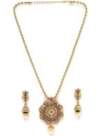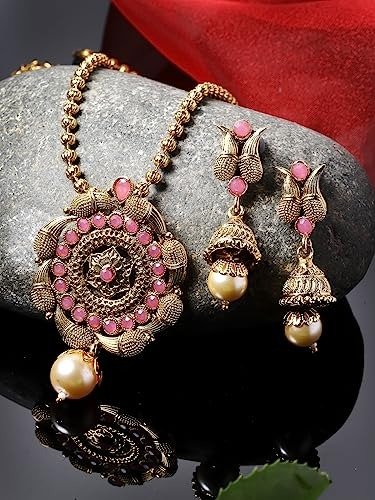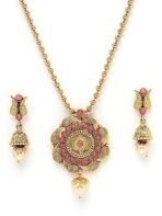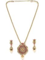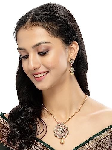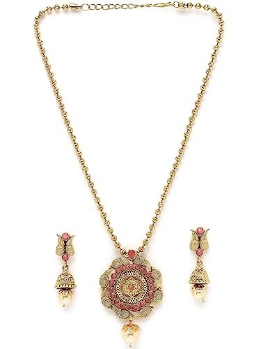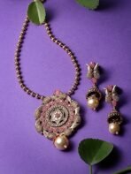 Enhance your fashion with the Sukkhi Striking Pink Gold Stone Multistring Long Necklace and Earring Jewelry Set, a stunning collection designed specifically for women who appreciate sophistication and allure. This set showcases a mesmerizing pink gold stone centerpiece elegantly arranged in a multistring long necklace format, radiating elegance and charm. The coordinating earrings beautifully complement the necklace, infusing your outfit with an air of refinement. Crafted with exceptional attention to detail, this set guarantees both durability and a hint of opulence. Make a bold impression with this Sukkhi jewelry set, an ideal selection for any event, and relish the admiration that accompanies wearing this captivating piece.