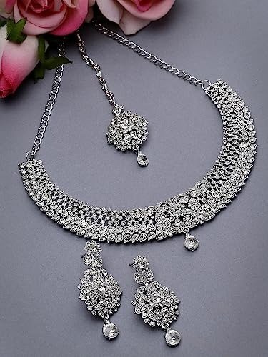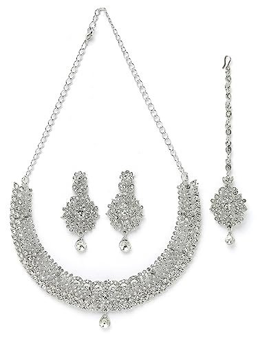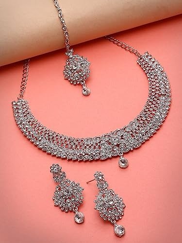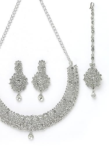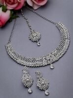 Sukkhi Showstopping Silver AD White Stone Necklace Set with Maangtikka – Fast Shipping to USA & Canada