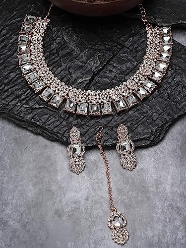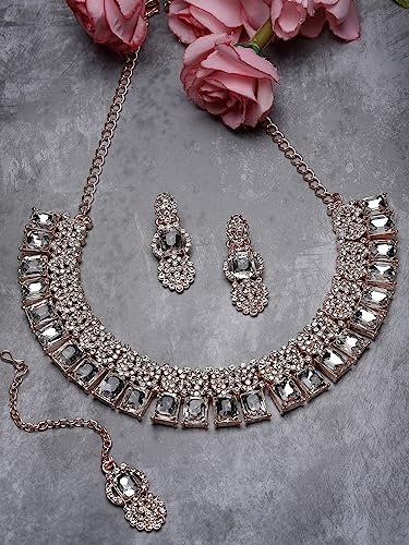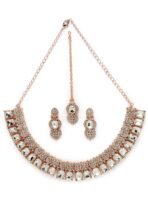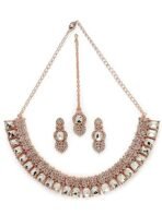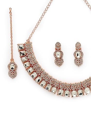 Sukkhi Tasteful Rose Gold AD White Stone Necklace Set with Maangtikka – Fast Shipping to USA & Canada