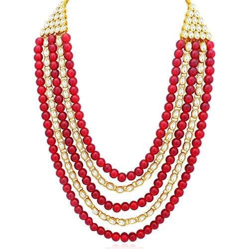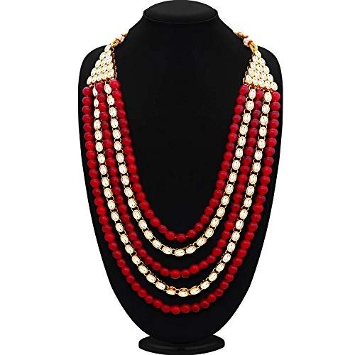 This exquisite five-string necklace set, adorned with sparkling gold plating and kundan, is designed for women. Women have a deep appreciation for jewelry, particularly artificial pieces that enhance their beauty. They don these adornments for various occasions, with particular significance during ring ceremonies, weddings, and festive celebrations. Additionally, they can be worn on a daily basis. Elevate your moments with this stunning collection. This jewelry showcases a distinctive, traditional design with an antique finish, making it truly one-of-a-kind.