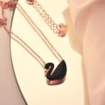 - The Black Swan Rose Gold Necklace is a stunning blend of elegance and allure. The pendant showcases a swan silhouette adorned with sparkling crystals. Its rose gold finish imparts a sense of warmth and contemporary style, enhancing the piece’s luxurious appeal. Size Specifications: Pendant: Length: 1.5 cm | Width: 1.7 cm Chain: Length (one side): 20 cm | Necklace Weight: 4 g.