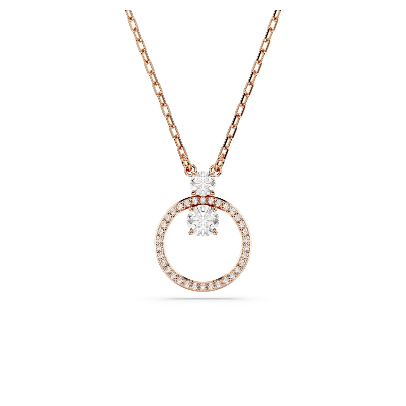 Offering a modern interpretation of the timeless circle pendant, this jewelry piece is plated in rose gold tone and showcases a central pav? ring adorned with sparkling clear Swarovski Zirconia. Two larger prong-set Swarovski Zirconia secure the design beautifully. This pendant is both striking and sophisticated, making it perfect for wearing solo or alongside a coordinating pair of Constella earrings.