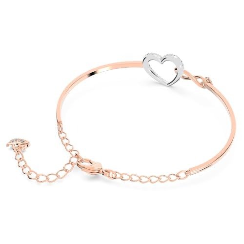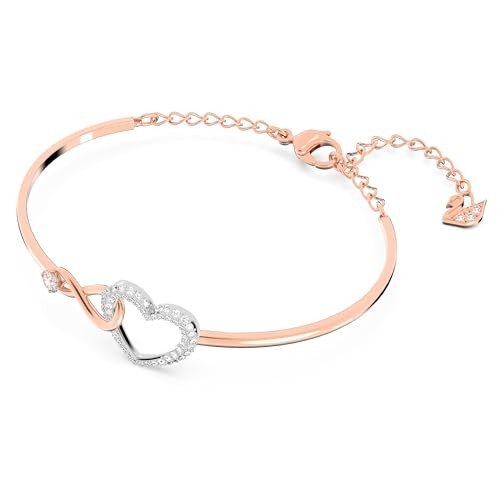 An emblem of everlasting affection: This sophisticated Swarovski bangle features intertwined symbols of love and eternity. Adorned with white Swarovski crystals, the heart design harmoniously pairs with the infinity symbol, creating a genuinely romantic aesthetic. The combination of mixed metals achieves a flawless balance of warm and cool hues, enhancing the overall design. It serves as a delightful gift?and a heartfelt promise?for someone truly special.
