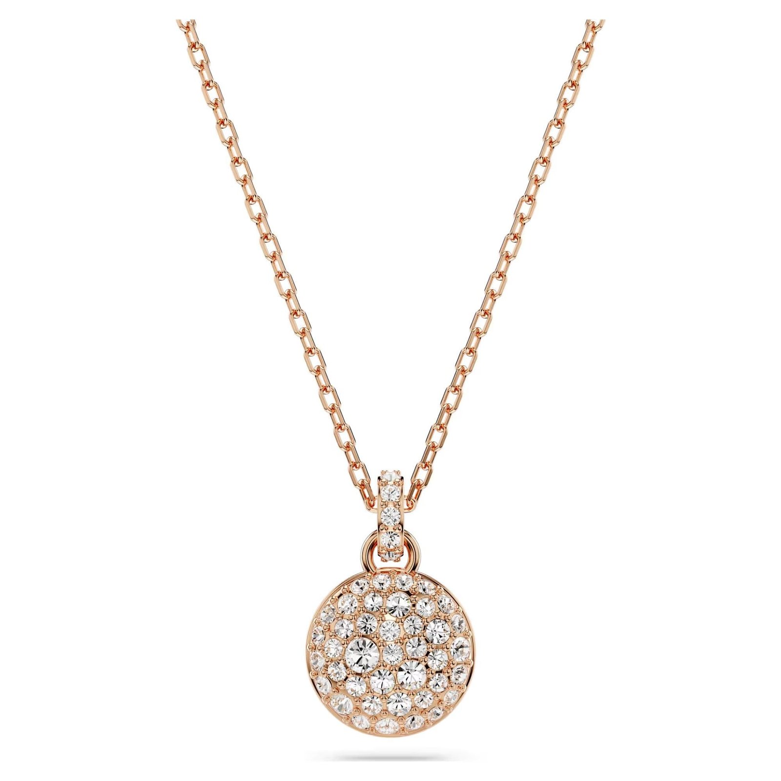A realm of enchantment beckons: This pendant, inspired by the cosmos, will add a stunning touch to any outfit. Crafted in rose gold plating, it hangs from a fine chain secured with a lobster clasp and showcases a domed meteor design, elegantly embellished with a snow pav? of clear round crystals in varying sizes.
