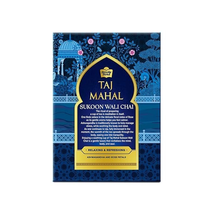 - Calming Fusion: Taj Mahal Sukoon Wali Chai is a tranquil tea blend enriched with Ashwagandha and Rose, ideal for relaxing and revitalizing your senses.