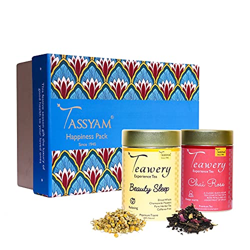 - Tassyam’s Happiness Pack: Features a premium blend of Chai Rose tea (comprising black tea, rose petals, and spices, 50g) and Chamomile tea (made from pure chamomile flowers, 50g).