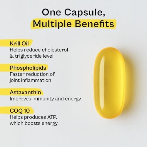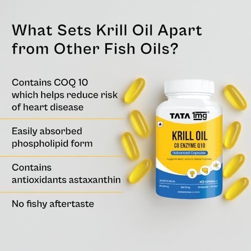 TATA 1mg Antarctic Krill Oil with CoQ10 is an advanced Omega-3 supplement formulated to support cardiovascular and joint wellness. Featuring phospholipid-bound Omega-3s for enhanced absorption, it also includes CoQ10 to promote optimal heart muscle performance and Astaxanthin for robust antioxidant protection. Harvested from pristine Antarctic krill, this supplement is easy to digest and leaves no fishy aftertaste.