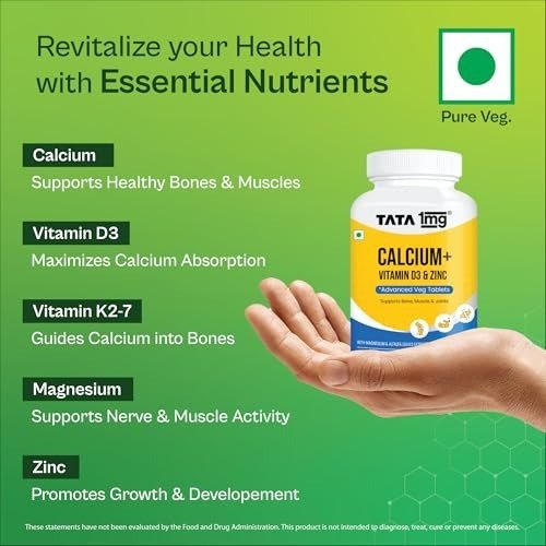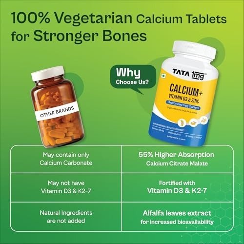 Tata 1mg Veg Calcium enhances bone density, strengthens bones, and promotes better muscle function.