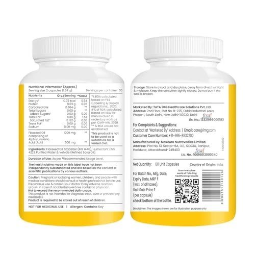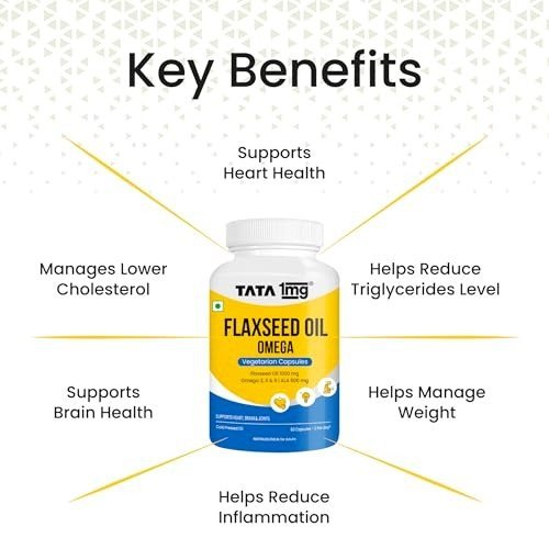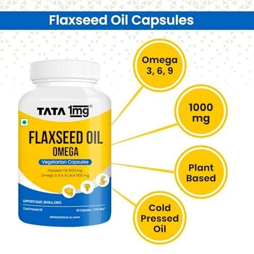 - Tata 1mg Flaxseed Oil 1000mg is a cold-pressed, plant-derived oil. Packed with Omega 3, 6, and 9 fatty acids, these vegetarian capsules help promote optimal heart health.