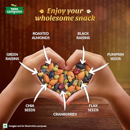 “Enjoy a Crunchy and Nutrient-Dense Dry Fruit and Seed Medley! Treat yourself to the delectable experience of Tata Sampann Delight Dry Fruit & Seed Mix. Savor these delightful, power-packed, and crunchy snacking choices tailored for you. This blend of dried fruits and seeds is subjected to over 20 quality checks to guarantee that you receive only the finest quality. Relish this tasty mix that is abundant in Protein and Dietary Fiber, loaded with Magnesium, and a source of Phosphorus. The assortment features Roasted Almonds, Cranberries, Black Raisins, Green Raisins, Pumpkin Seeds, Flax Seeds, and Chia Seeds, all designed to enhance your energy levels. Perfect for breakfast, a midday snack, or a convenient on-the-go treat, elevate your snacking experience with Tata Sampann Delight Dry Fruit & Seed Mix today! Storage Guidelines: Keep in a cool, dry location, away from direct heat or sunlight.”