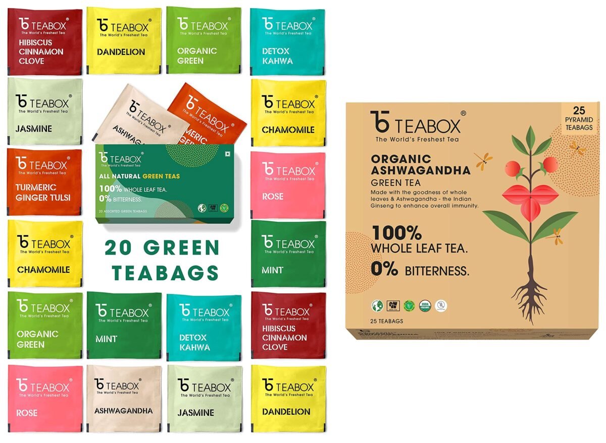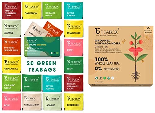 Teabox Ashwagandha Green Tea Bags – 25 Count | For Immune Support & Enhanced Memory | Crafted with 100% Whole Leaf, Natural Ashwagandha & Cardamom | Includes 2 Free Samples