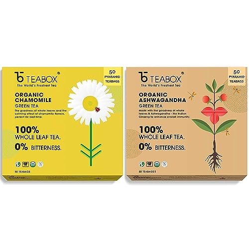 Teabox Organic Ashwagandha Green Tea 50 Teabags | Ayurvedic Fusion of Premium Green Tea and Natural Ashwagandha | Enhances Immunity and Boosts Memory | Silken Pyramid Teabags