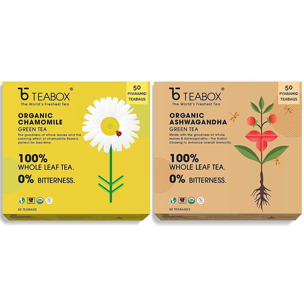 Teabox Chamomile Green Tea for Stress Relief & Restful Sleep, Crafted from 100% Whole Leaf & Natural Chamomile Blossoms, 50 Silken Pyramid Tea Bags