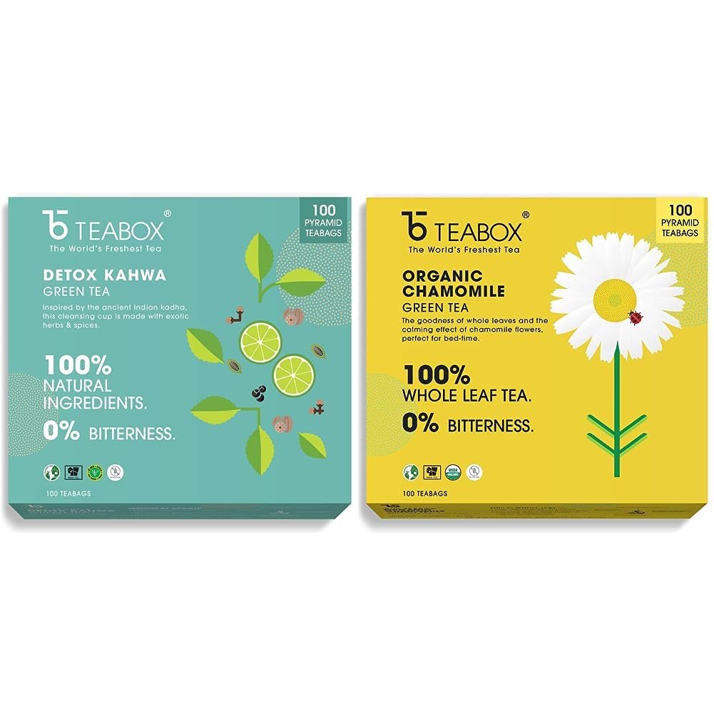 Teabox Detox Kahwa Green Tea 100 Teabags & Teabox Chamomile Green Tea for Stress Relief & Good Sleep, 100 Silken Pyramid Tea Bags – Fast Shipping to USA & Canada