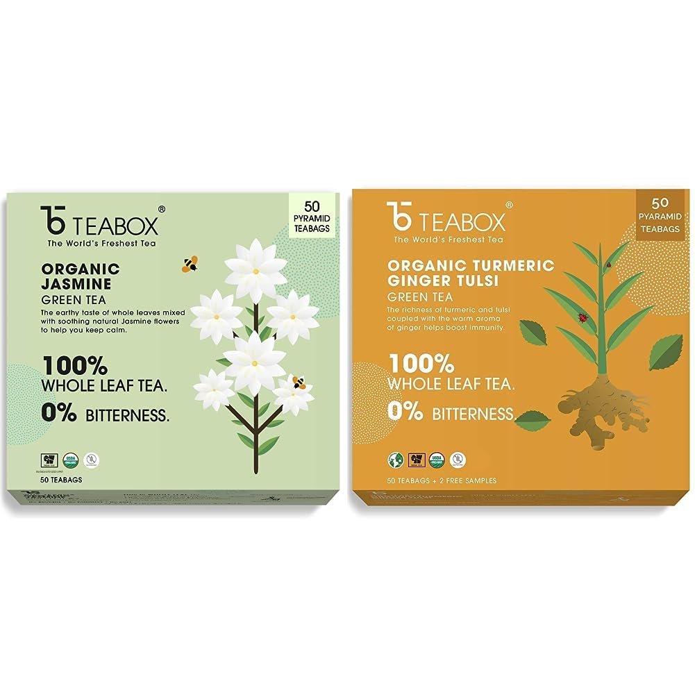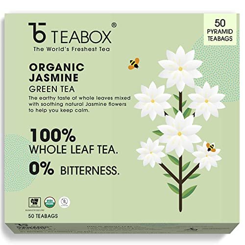 Teabox Organic Jasmine Green Tea – 50 Teabags | Sourced from Madurai | Promotes Calmness and Relaxation | Crafted with 100% Whole Leaves, Natural Jasmine Blossoms & Authentic Flavors