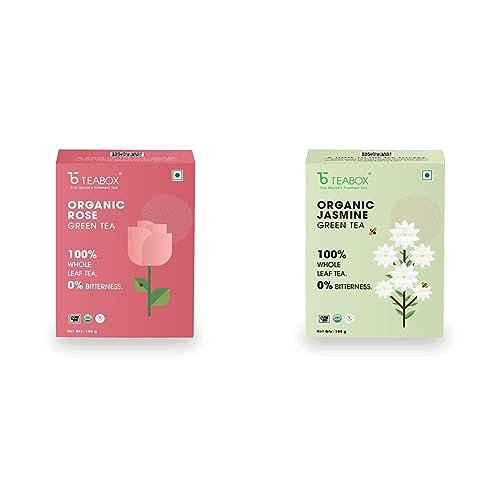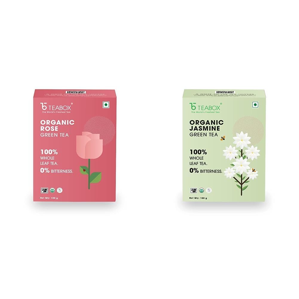 Teabox Organic Rose Green Tea 100g & Teabox Organic Jasmine Green Tea 100g | Sourced From Madurai | For Calm Mind and Relaxation – Fast Shipping to USA & Canada