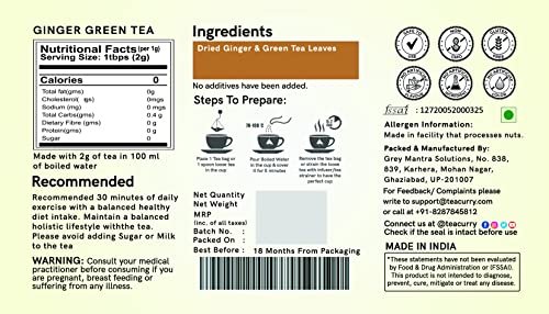 - Exquisite Ginger Green Tea – TeaCurry’s Ginger Green Tea is crafted to nourish your body with ingredients that cater to both daily wellness and specific health concerns. Each calming brew features a distinctive combination of ginger pieces and green tea leaves, meticulously blended for your health. These elements have been harmoniously sourced to create a delightful beverage.