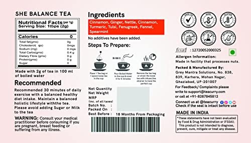 - 100% Natural Ingredients – Teacurry PCOS PCOD Tea or She Balance Tea features a potent Ayurvedic blend, including Himalayan Nettle, robust ginger from Orissa, Meghalayan cinnamon, Krishna Tulsi from Sasangir, Turmeric Curcumin Longa from Andhra Pradesh, Foenum Graecum Fenugreek from Rajasthan, Gujrat Fennel, and Mentha Spicata Spearmint from West Bengal. This combination adheres to all recommended standards set by FSSAI, WHO, and NCBI.