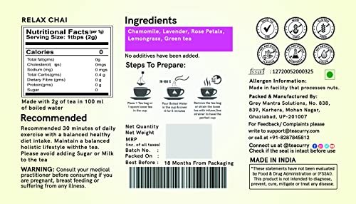 Teacurry Relax Tea is a specially crafted infusion of green tea combined with Chamomile, Rose, Lavender, and Lemongrass. This entirely natural tea is designed to alleviate stress, soothe the nerves, and promote mental relaxation. Research indicates that Teacurry Stress Relief Tea provides immediate relaxation benefits due to the antioxidants found in Chamomile and Lavender, particularly Apigenin. This tea offers four distinct advantages: it combats anxiety, alleviates insomnia, slows down the aging process, and enhances skin radiance. With its delightful floral flavor, Teacurry’s Mind Relax Tea also aids in fighting infections and regulating cholesterol levels in the body.