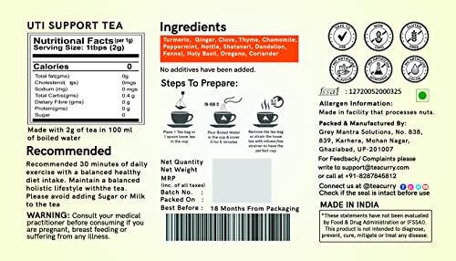 • 100% Natural Components – Teacurry’s Herbal UTI Support Tea is crafted from a potent Ayurvedic blend, including dried chamomile flowers from Himachal Pradesh (Matricaria Chamomilla), peppermint from Haryana, the Asparagus sarmentosa Linn variety of Shatavari from Arunachal Pradesh, rare Himalayan Nettle from the foothills of Uttarkhand, robust ginger from Orissa, fennel from Gujarat, holy basil, oregano, and Himalayan thyme from Uttarkhand, as well as Penang clove from Tamil Nadu’s farmlands.