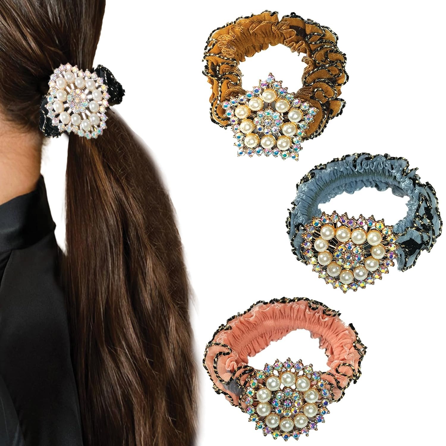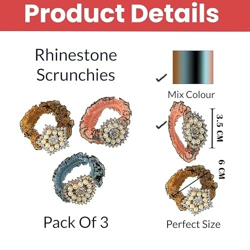 7 reviews for TEMPERIA (Pack Of 3) Rhinestone Studded Scrunchies For Women & Girls – Stylish Luxury Ponytail Rubber Band Ties for Hair Accessories – (Random Colors & Designs) (MN02) – Fast Shipping to USA & Canada