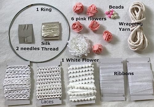 - COMPLETE CRAFT SET – Contains a 6-inch embroidery hoop, vibrant ribbons and laces, wrapping cord, weaving thread, assorted beads, four foam flowers, one organza flower, and two needles.