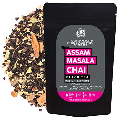 The Tea Trove Assam Black Masala Chai Tea Loose Leaf, 100% Natural, Organic Chai Masala Cinnamon, Cardamom, Clove and Ginger for Rich and flavorful Hot Chai Latte or Iced chi Tea- (100 gm,50 Cups) – Fast Shipping to USA & Canada