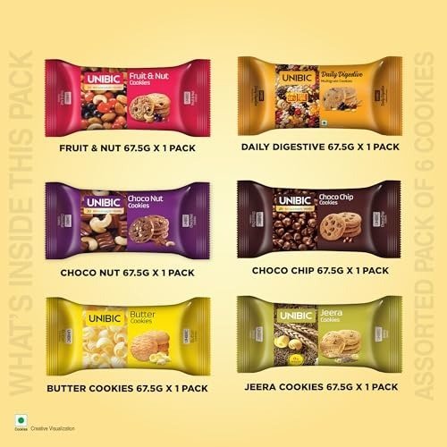 Unibic, Assorted (Pack Of 6 X 75 G/ 67.5G) | Biscuits Combo Pack | Choco Chip | Butter | Fruit & Nut | Honey Oatmeal I Jeera | Cashew | 450g / 405g Weight may Vary – Fast Shipping to USA & Canada