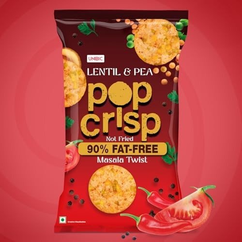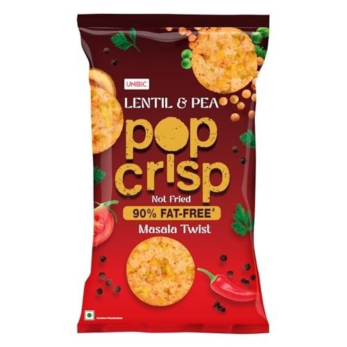 Unibic Pop Crisp ? Time to Pop and Snack! Bursting onto the scene from our range of mouthwatering chips is the Lentil & Pea Masala Twist. Savor the nourishing blend of lentils and peas, expertly popped to deliver a savory treat that?s both healthy and delicious. Ditch oily, high-fat snacks for good! These tempting crisps are 90% fat-free, so you can indulge your cravings while staying mindful of your well-being. Enjoy the satisfying crunch without any guilt! Unibic Pop Crisp are air-popped, not fried, giving you a light, crispy bite without sacrificing flavor. They?re the perfect pick for mindful munching-at your desk, on the move, or relaxing at home. Upgrade your snack game with a tastier, better-for-you alternative. Unibic Pop Crisp isn?t just another snack; it?s irresistibly tasty and guaranteed to excite your palate! Whether you?re snacking solo or sharing at a gathering, get ready to pop and enjoy. Grab a handful of these zesty, crunchy masala lentil & pea crisps. Pop it like a pro!