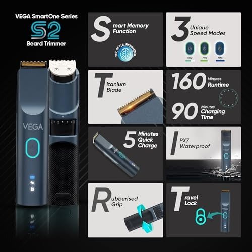 Vega SmartOne S2 Trimmer for Men with 160 mins Runtime, Battery Powered, IPX7 Waterproof & 40 Length Settings, 3 Unique Speed Modes, Rubber Grip, Travel Lock, Travel Friendly, (VHTH-31) – Fast Shipping to USA & Canada
