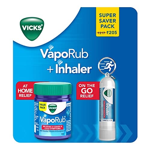 Introducing the Vicks VapoRub 50ml and Vicks Inhaler combo pack! Experience the soothing effects of Vicks VapoRub at home to alleviate cough and cold symptoms, while the convenient Inhaler provides immediate relief for nasal congestion when you’re on the move. Vicks VapoRub 50ml offers relief from cold symptoms, cough, nasal blockage, headaches, body aches, muscle stiffness, and breathing difficulties. The Vicks Inhaler is a portable, non-medicated nasal inhaler that delivers calming vapors for easy breathing, infused with a refreshing menthol scent.