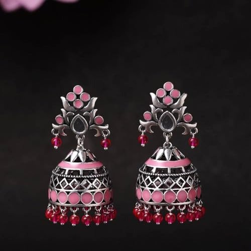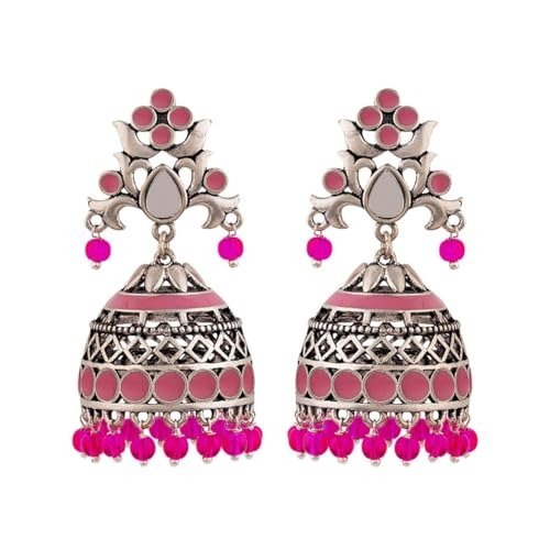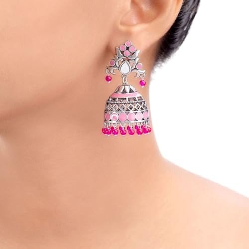 7 reviews for Voylla Brass Silver Oxidised Plating Rangabati Pink Embellishments Jhumka Earrings with Pearl Beads for Women and Girls – Fast Shipping to USA & Canada