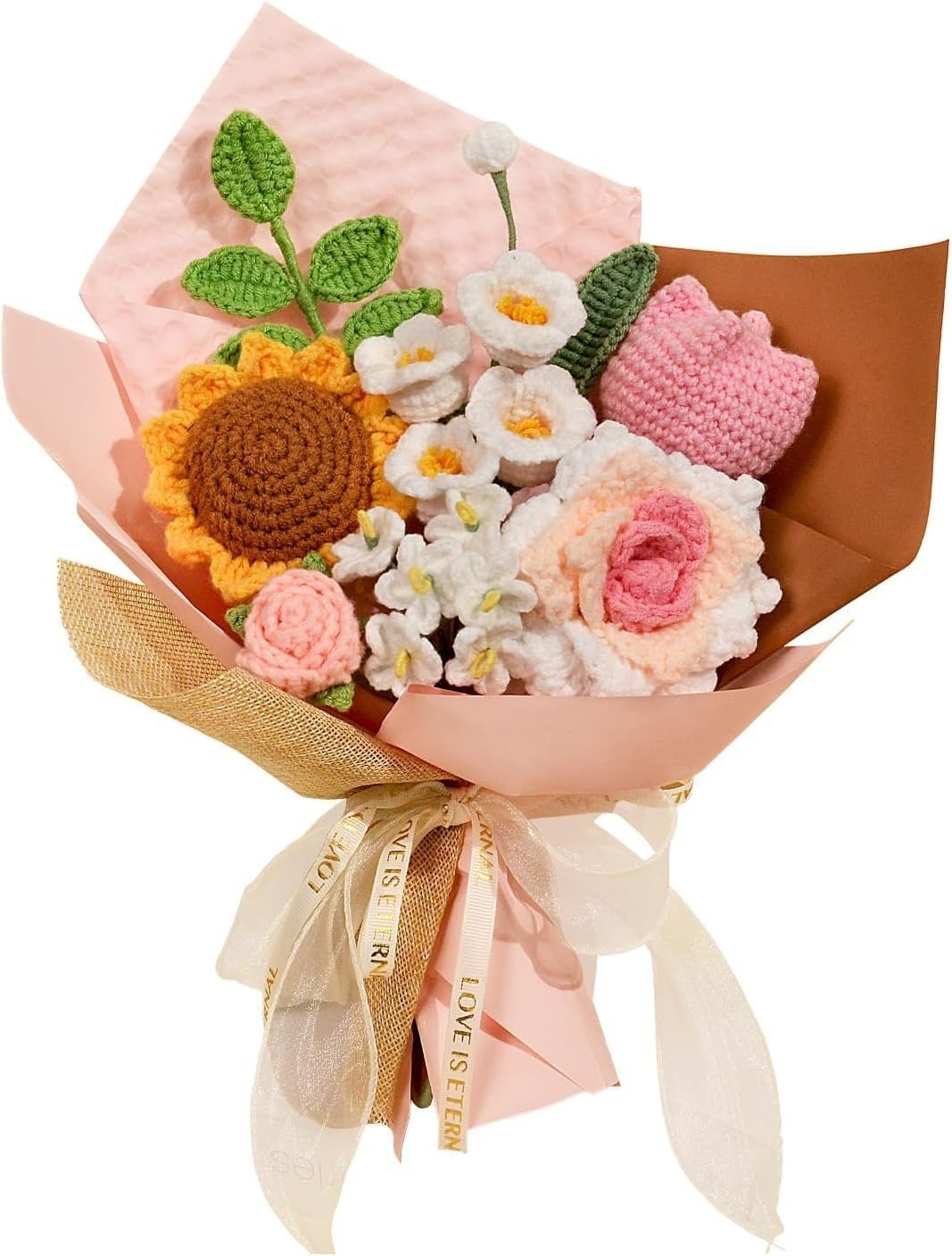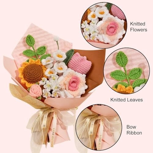- Colors: Offered in over 6 unique designs of large sunflower crochet bouquets.