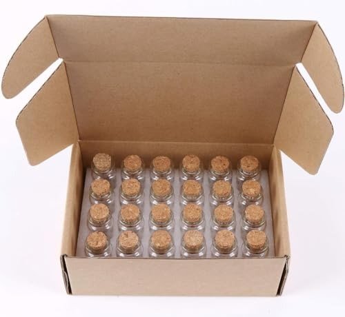 - Available in packs of 12, 24, or 36 small glass bottles with cork stoppers.