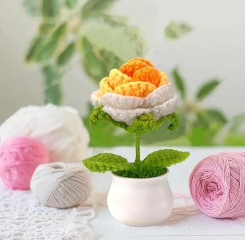 VRB DecTM 1 Pcs Crochet Flowers Artificial Rose for Office Desk Car Dashboard Decor,Table Decor,Home Decoration, Office, Bedroom, Christmas Decor, Wedding (Big Shaded Yellow Rose with Pot) – Fast Shipping to USA & Canada