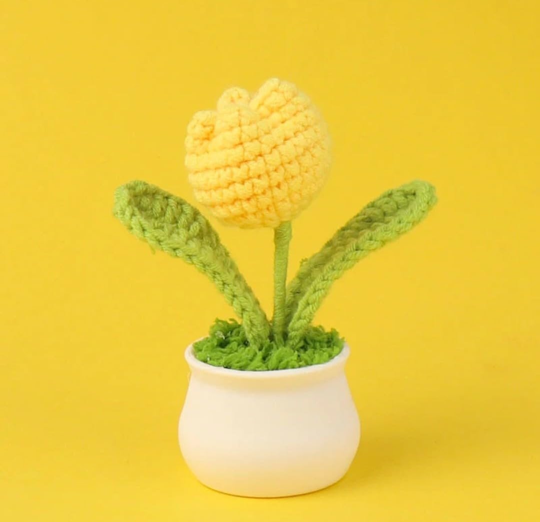 VRB DecTM 1 Pcs Crochet Flowers Artificial Tulip for Office Desk Car Dashboard Decor,Table Decor,Home Decoration, Office,Decor,Bedroom, Christmas (Yellow Tulip with Plastic Pot) – Fast Shipping to USA & Canada