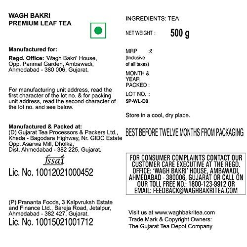 - Item 1: Ingredients: Wagh Bakri leaf tea in a poly pack, 500g; Material: Vegetarian