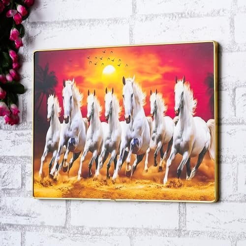 Webelkart Premium Big Seven Running Horses With Frame For Wall Vastu UV Print, Sunset Background Canvas Painting,Seven Horse Large Decorative Painting for Home Living Room,(8 MM 17.32″ Inches) – Fast Shipping to USA & Canada