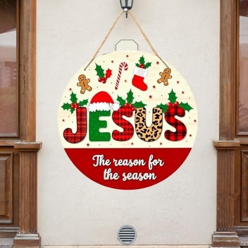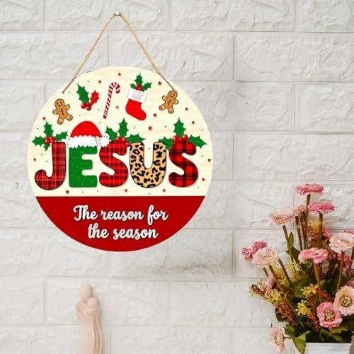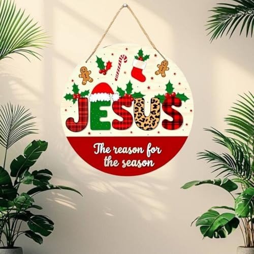 Webelkart Infuse your home with the true essence of Christmas through this delightful round wall hanging, boldly declaring ‘Jesus – The reason for the season.’ This eye-catching decoration showcases festive lettering in trendy buffalo plaid and leopard print, topped with a playful Santa hat and sprigs of holly berries. The design is further enhanced by joyful holiday motifs such as gingerbread figures, candy canes, Christmas stockings, and holly leaves, all set against a cozy cream backdrop with a striking red lower panel. Expertly crafted from sturdy acrylic, this 10-centimetre ornament is equipped with a rustic jute rope for effortless hanging. Ideal for bringing a heartfelt and meaningful accent to your seasonal Decor, this piece serves as both a charming ornament and a gentle reminder of the spiritual heart of the holidays. The timeless red and green palette, paired with modern pattern combinations, ensures this wall hanging seamlessly fits into any festive setting-be it your living room, entryway, or as part of a larger Christmas display.