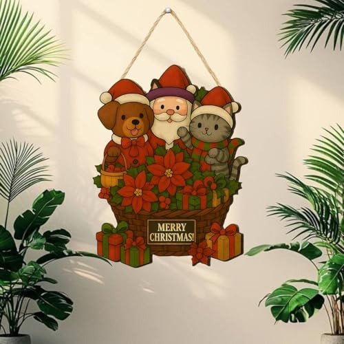 Infuse your home with festive cheer using this enchanting Christmas wall hanging from Webelkart. This delightful decoration showcases a whimsical scene featuring lovable holiday characters-a playful puppy, a merry Santa Claus, and a snug cat-all donning bright red Santa hats and nestled together amidst vivid poinsettia blooms in a rustic basket. The arrangement is further adorned with lush green holly leaves and colorfully wrapped gifts at the base, creating a complete and joyful Christmas tableau. A gleaming gold plaque inscribed with ‘MERRY CHRISTMAS!’ lends an elegant finishing touch to this inviting display.