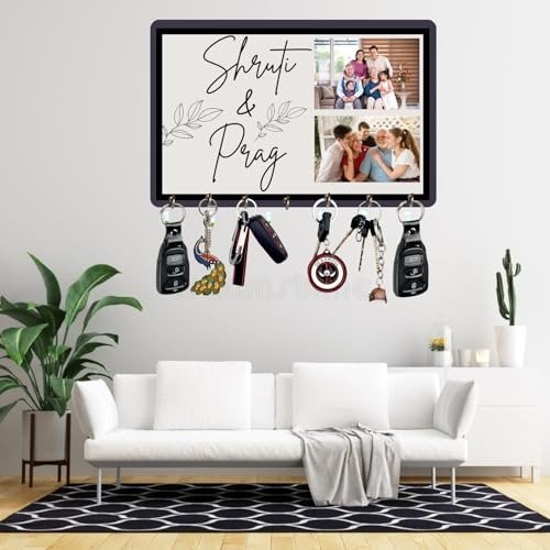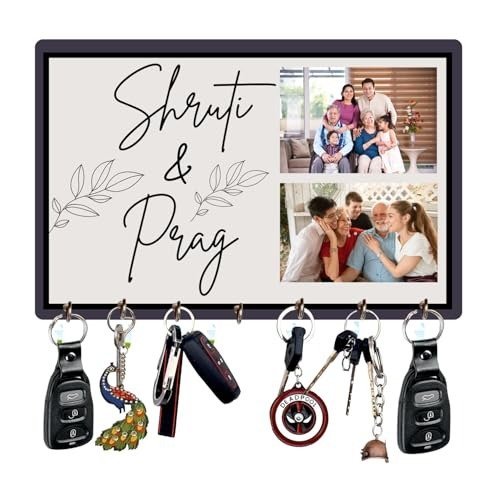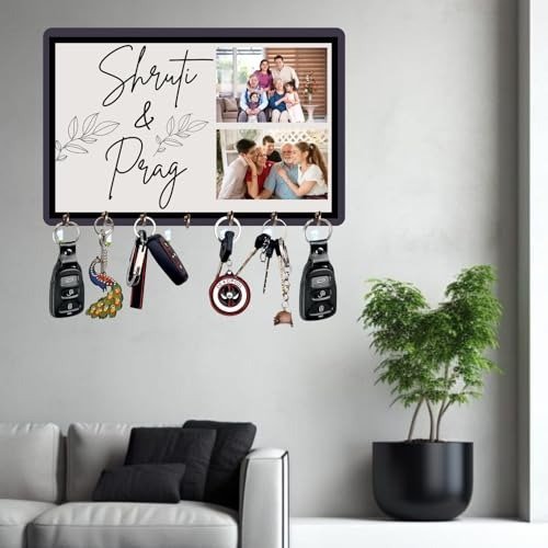 Elevate your entryway with this sophisticated personalised key holder from Webelkart. Expertly crafted from premium wood, this wall-mounted organiser boasts seven durable hooks to keep your keys orderly and within easy reach. What sets this key holder apart is the option to personalise it with your family name and a favourite photograph, transforming it into a treasured piece of home decor. With dimensions of 30 x 25 cm, it offers generous space for customisation as well as key storage. The well-considered design seamlessly blends practicality with visual charm, making it a perfect addition to your home or a thoughtful gift for loved ones. The rich wooden finish infuses your space with warmth while ensuring your keys remain organised and accessible. Ideal for families who appreciate both tidiness and personalised touches, this key holder functions as a useful storage solution and a stylish decorative feature for your wall.