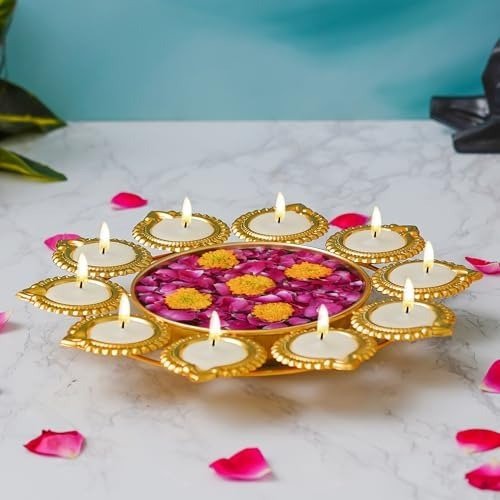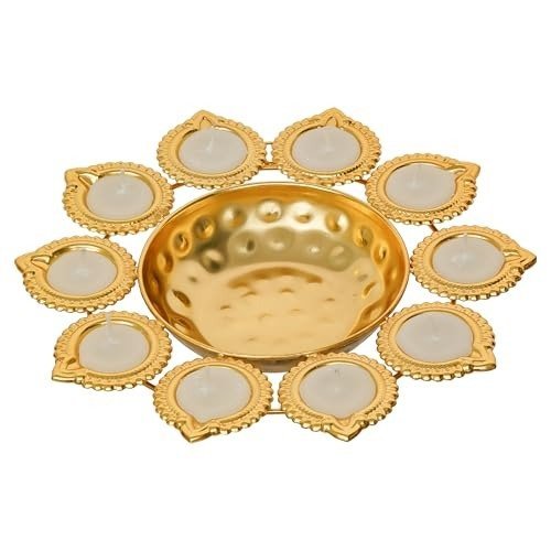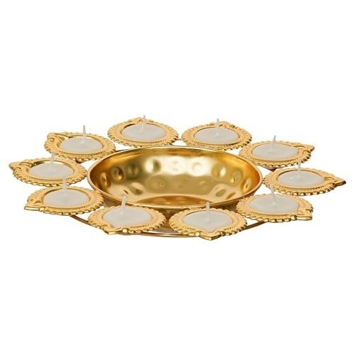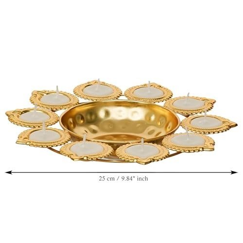 Webelkart Premium Diya Shape Gold Plated Decorative Urli Bowl with Wax Candle for Home Decor Handcrafted Bowl Diwali Decor Item (10″ Inches) – Fast Shipping to USA & Canada